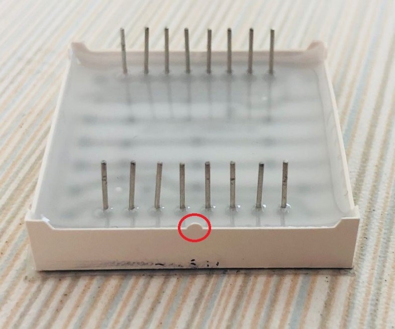 大家翻到点阵屏的背面,可以看到有一侧凸出了一个小点,这个小点表示为点阵屏的底部。 通过这个小点,我们就可以区别开点阵屏的针脚,下图中用红点表示底部凸起的小点。